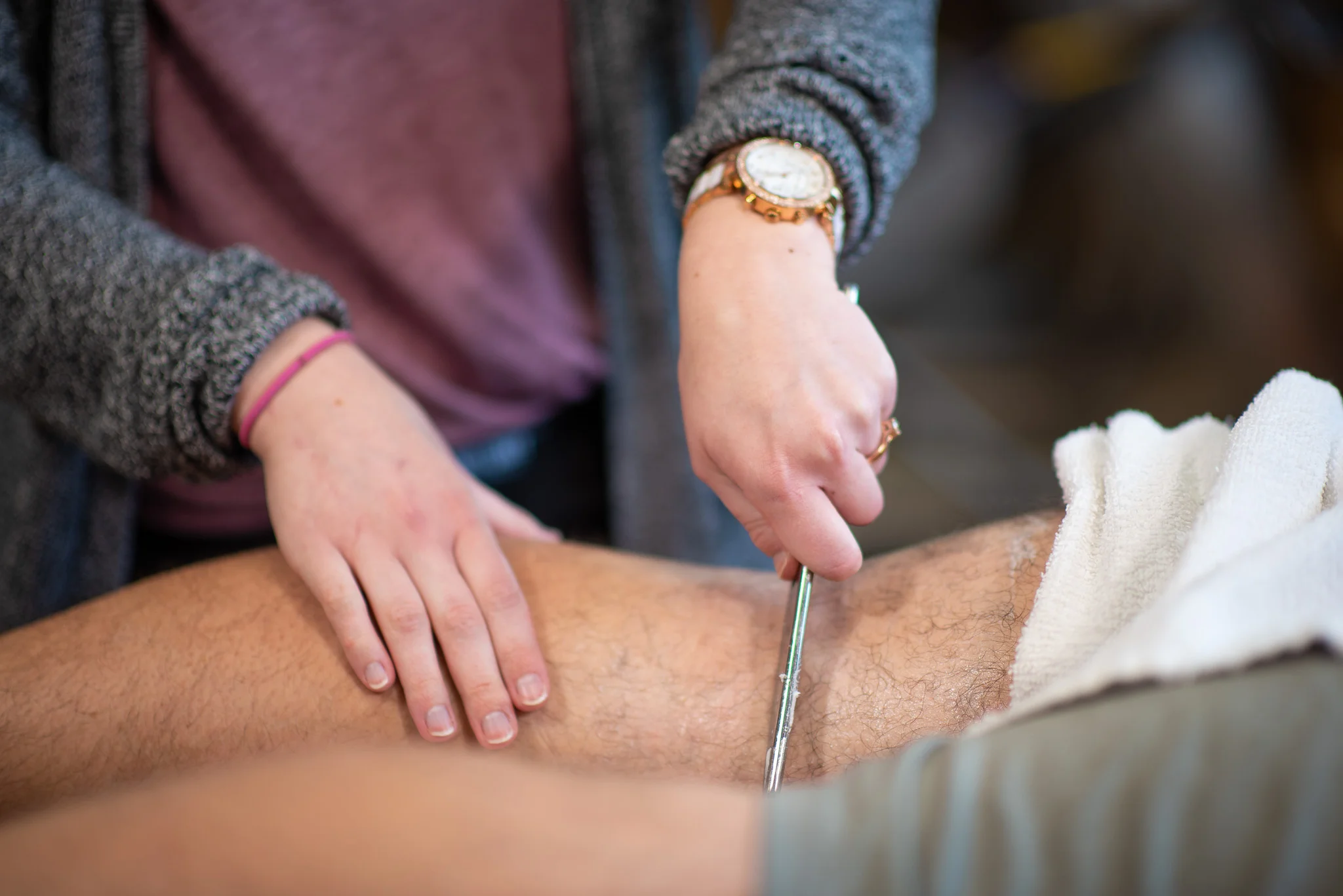 Collin Zimmerman, PT, DPT treating a post-surgical ankle patient with the Graston Technique.